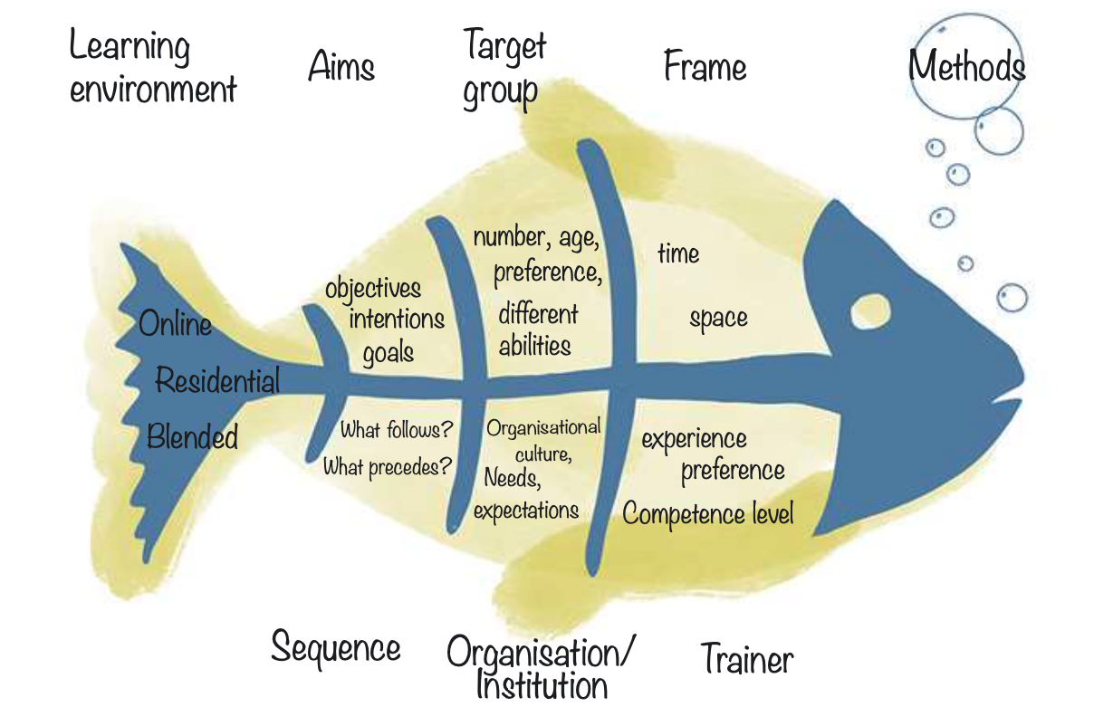 The above is adapted from the T-kit Training Essential, which provides a comprehensive overview of how to design learning activities and choose methods. See the fish model below and download the complete explanation of how to apply it to practice.